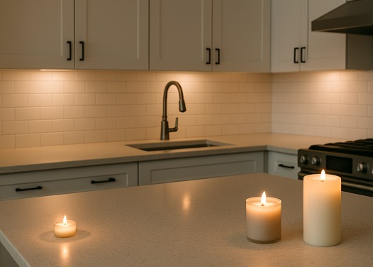 “In the kitchen,” Carlos says. “I thought we'd try something different. Why don't you come in here and hop up on the kitchen counter?”