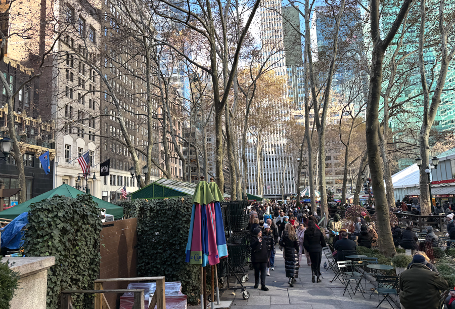 We continued to Bryant Park and Carlos’ eyes lit up when he saw the cocoa stand. “I wonder if that’s the one from ‘Christmas Cocoa’ on Hallmark?” he said. I said “probably,” knowing full well that the “real” one was on a soundstage in Toronto. His disappointment showed when he realized the line for cocoa stretched out of the park and onto 42nd Street.